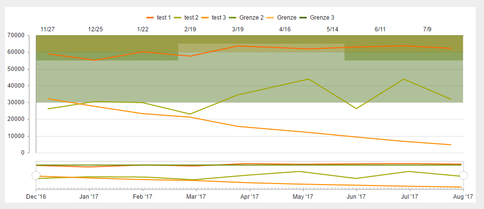 @{ ViewBag.Title = "Home Page";}<div id="example"> <div class="demo-section k-content wide"> <div id="chart"></div> </div> <script> function createChart() { $("#chart").kendoStockChart({ dataSource: { transport: { read: { url: "../Content/spain-electricity.json", dataType: "json" } }, schema: { model: { fields: { year: { type: "date" } } } } }, title: { text: "" }, dateField: "year", legend: { visible: true, position: "top" }, seriesDefaults: { type: "line", markers: { visible: false } }, series: [{ field: "nuclear", name: "test 1", axis: "bottom" }, { field: "hydro", name: "test 2", axis: "bottom" }, { field: "wind", name: "test 3", axis: "bottom" }, { field: "grenze2", name: "Grenze 2", type: "area", missingValues: "interpolate", axis: "top", line: { style: "step" } }, { field: "grenze", name: "Grenze", type: "area", missingValues: "interpolate", axis: "top", line: { style: "step" } }, { field: "grenze3", name: "Grenze 3", type: "area", missingValues: "interpolate", axis: "bottom", line: { style: "step" } }, ], valueAxes: [ { name: "top", labels: { visible: true, format: "{0}" }, reverse: true, visible: true, axisCrossingValues: 70000, min: 70000, max: 0 }, { name: "bottom", labels: { visible: true, format: "{0}" }, visible: true, reverse: false, min: 0, max: 70000 }, ], categoryAxis: { field: "year", type: "date", labels: { rotation: 0 }, crosshair: { visible: true }, majorGridLines: { visible: false }, }, valueAxis: { labels: { format: "N0" }, majorUnit: 10000, //plotBands: [{ // from: 0, // to: 10000, // color: "#c00", // opacity: 0.3 //}, { // from: 70000, // to: 60000, // color: "#c00", // opacity: 0.3 //}, { // from: 70000, // to: 55000, // color: "#0066ff", // opacity: 0.3 //}], }, tooltip: { visible: true, shared: true, format: "N0" }, navigator: { series: [{ field: "nuclear", name: "Hauptpresse" }, { field: "hydro", name: "Dehner 1" }, { field: "wind", name: "Dehner 2" }, { field: "grenze", name: "Grenzwert" }], select: { from: "2016/12/01", to: "2017/10/07" }, categoryAxis: { labels: { rotation: "auto" } } } }); } $(document).ready(createChart); $(document).bind("kendo:skinChange", createChart); </script></div>