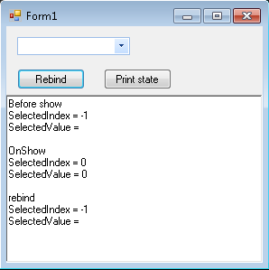 public partial class Form1 : Form { public Form1() { InitializeComponent(); Bind(GetList()); Print("Before show"); } public void Bind( List<DictionaryEntry> p_List) { radDropDownList1.ValueMember = "Key"; radDropDownList1.DisplayMember = "Value"; radDropDownList1.DataSource = p_List; radDropDownList1.SelectedIndex = -1; radDropDownList1.SelectedItem = null; radDropDownList1.SelectedValue = null; } private List<DictionaryEntry> GetList() { return new List<DictionaryEntry> { new DictionaryEntry(0, "Entry 0"), new DictionaryEntry(1, "Entry 1") }; } private void button1_Click(object sender, EventArgs e) { Bind(GetList()); Print("rebind"); } private void Print(string p_Message) { richTextBox1.AppendText(String.Format("{2}\nSelectedIndex = {0}\nSelectedValue = {1}\n\n", radDropDownList1.SelectedIndex, radDropDownList1.SelectedValue, p_Message)); } private void Form1_Shown(object sender, EventArgs e) { Print("OnShow"); } private void button2_Click(object sender, EventArgs e) { Print("Print state"); } }The problem is that when the form is shown DropDownList automatically selects first element in the list (SelectedIndex, SelectedItem,.. are updated but Text is not).