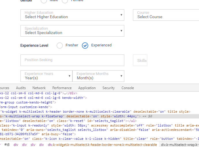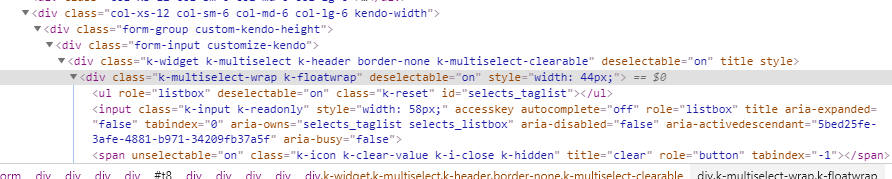 In kendo multiselect dropdown,the problem we were facing is -if we add a very big new skill which cannot be selected from existing,the kendo goes on increasing its width and also on adding a small new skill, the cursor goes the next line.Let me know your solution to the above problem.To solve this issue, we added a class kendo-width to the bootstrap div class col-xs-12 col-sm-6 col-md-6 col-lg-6 (see the image) and we get the kendo width on page load and resize and apply that value to the class -k-multiselect-wrap k-floatwrap so that the top problem can be solved.code- $( window ).on("load resize",function() {