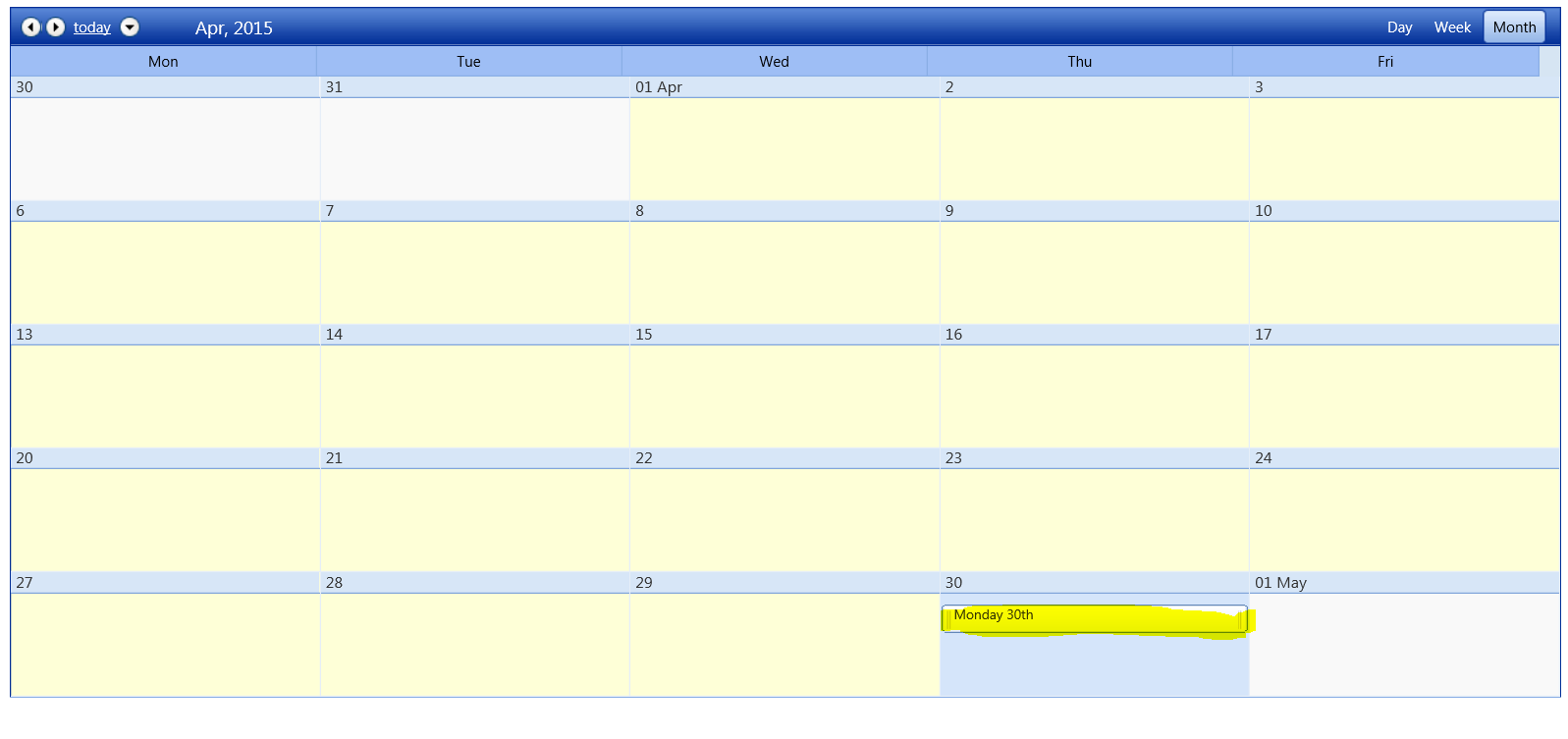 The appointment is created on 30th of April yet the day view is showing the 1st of April and the week view is showing a period from 30th of March to 3rd of April.
