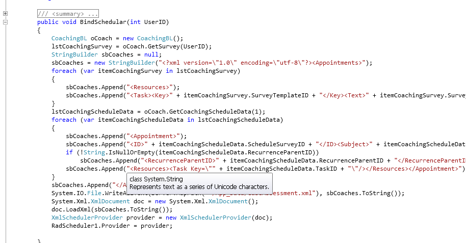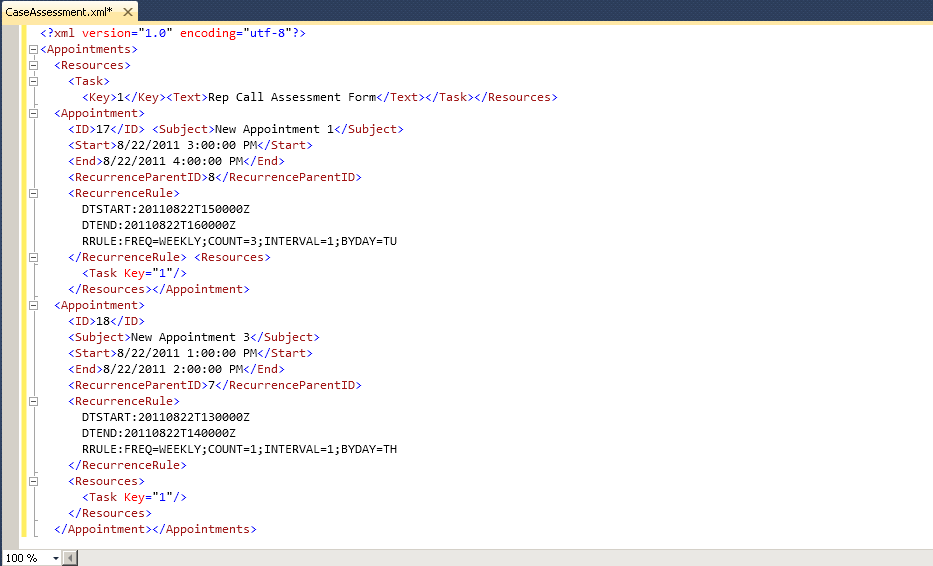 I am not able to shoe recurring appointments in radschedular. Non-Recurring Appointments are shown ok. I am binding radschedular with XML. I am attaching all important code needed with the post(Xml,Default.aspx code and Default.aspx.cs Code). Pls help me with this.