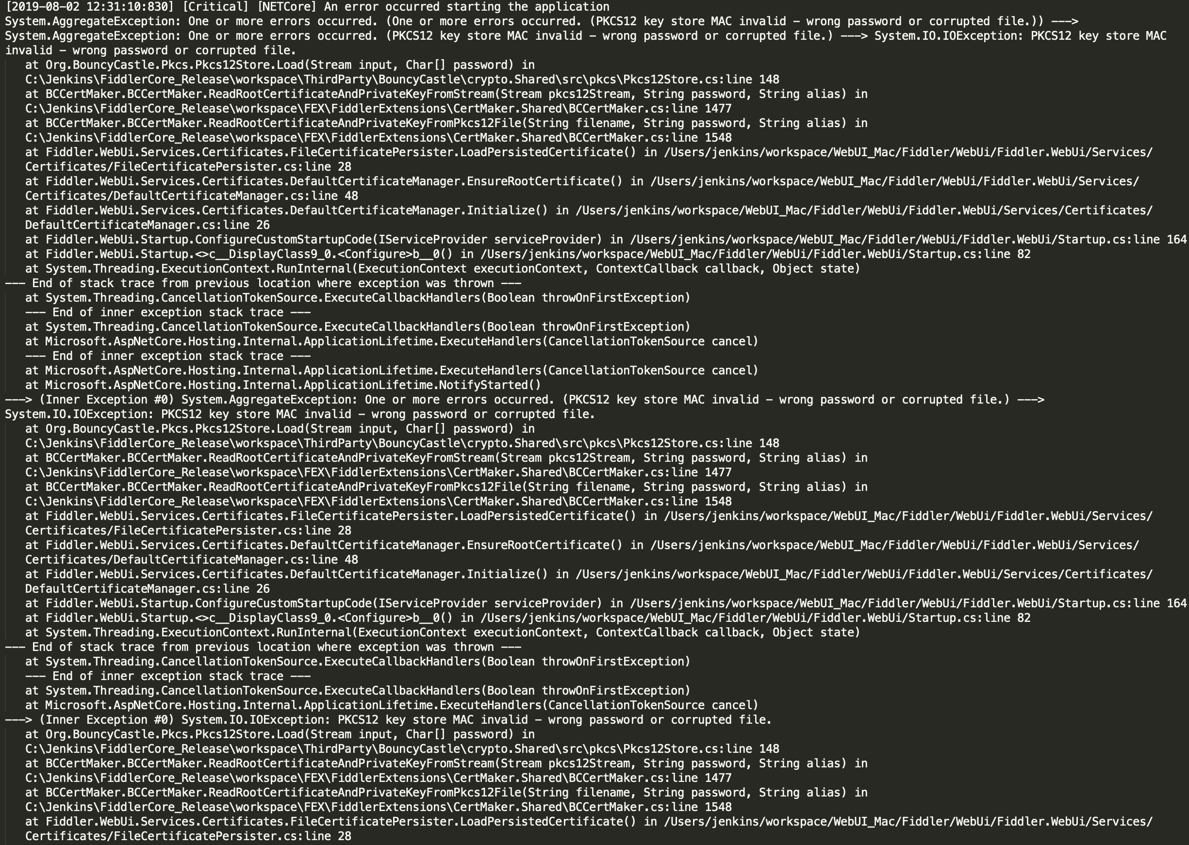 I'm still getting this error when closing the app after I delete the cert and reinstall the cert. This all happened when I started to use Charles and after I used Charles, I can't open FiddlerEverywhere anymore to get traffic. Before I was able to get traffic on my localhost without decrypt http and now I can't do that even when I reopen the app or reinstall the app. Can you take a look? Thanks.