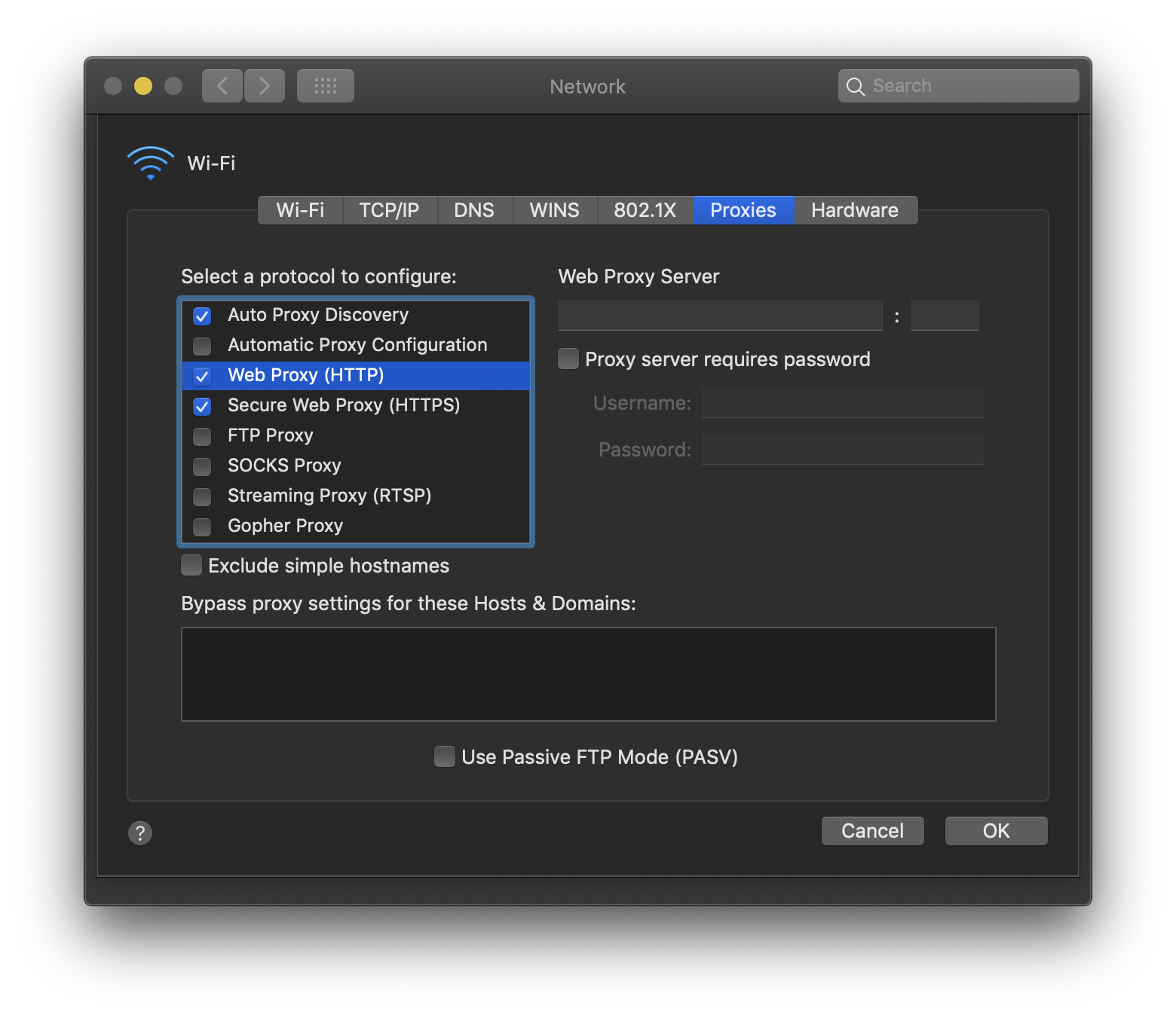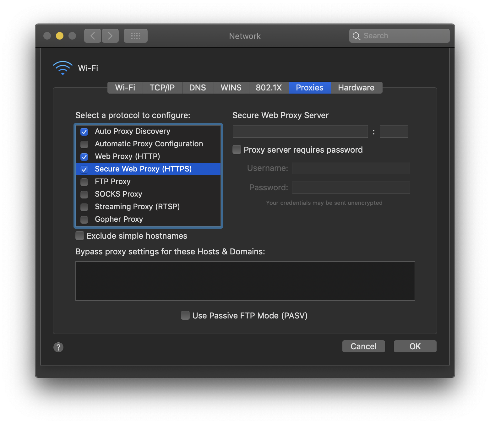 One last observation... my Mac proxy settings dialog box looks different than Eric's screen capture above.  There are additional settings that I do not know how to fill.  What should be entered for the "proxy server" string fields?