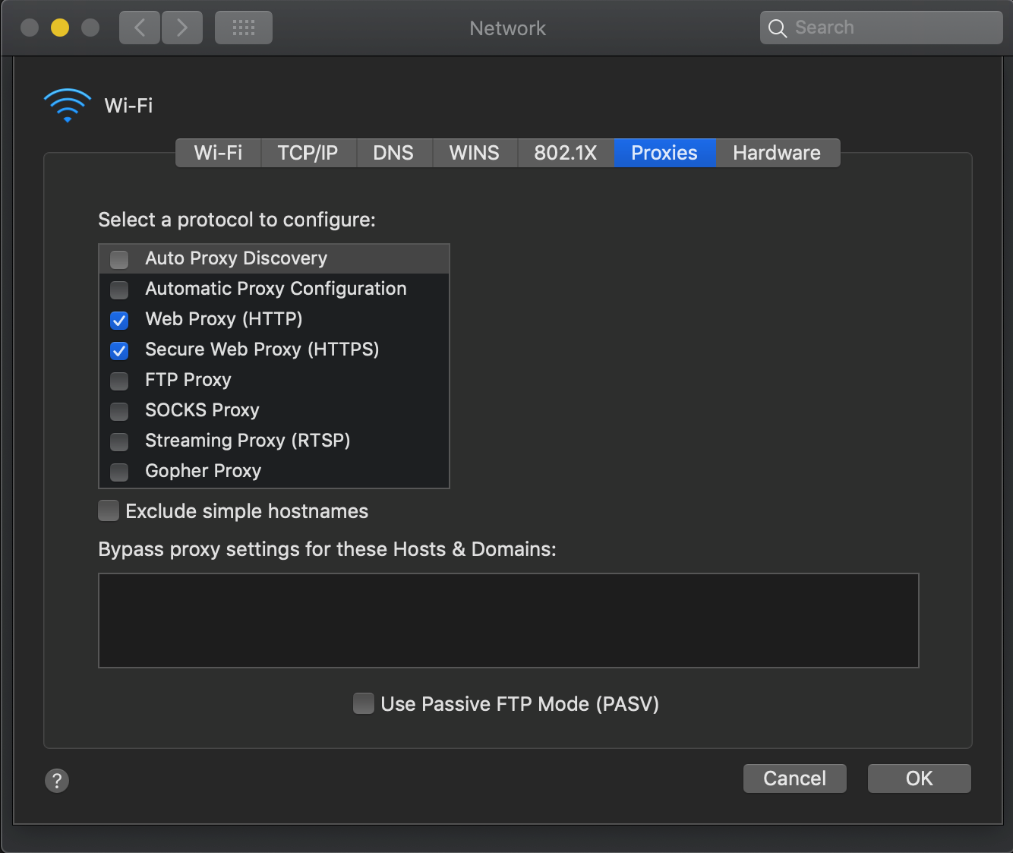 If the issue persists, as a workaround, manually set the Web Proxy and Secure Web Proxy in macOS settings. System Preferences -> Network -> Advanced
