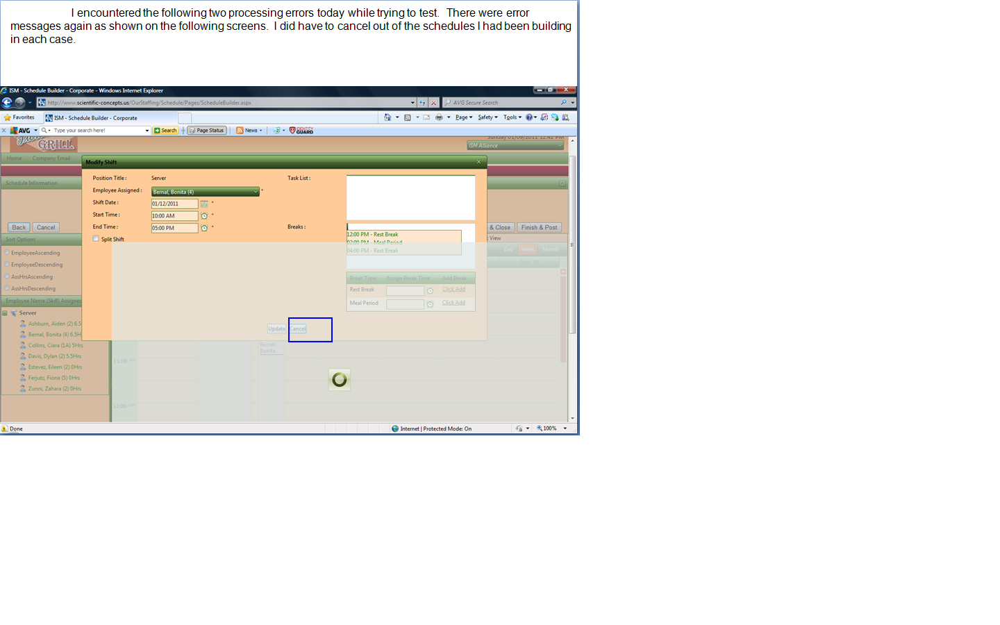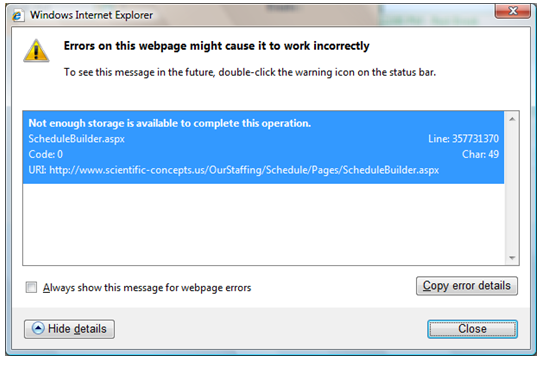 I am using scheduler control (Version : 2010.2.929.35). I attempted to update a appointment on the Modify appointment advanced window. When I clicked the Update button, the processing loading graphic appeared, but processed for an unusually long time. When it finally resolved, the window remained open and there was an exclamation point next to the Done message. When I clicked on the exclamation point there was a message about a not enough storage error. See screen captures attached.