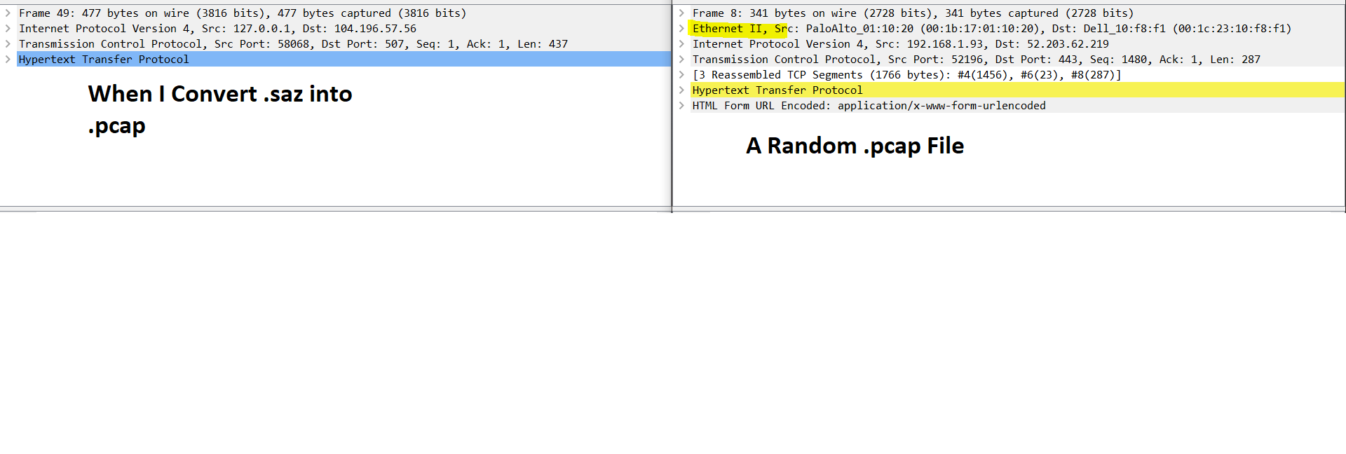 The described behavior is expected due to the differences between SAZ and PCAP formats. The official SAZ format description is as follows: