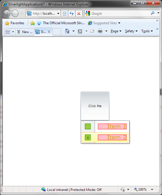<ToggleButton Content="Click Me" Height="100" Width="100" IsChecked="{Binding IsOpen, ElementName=rcm, Mode=TwoWay}"> <ToggleButton.Resources> <DataTemplate x:Key="ht"> <Grid> <Rectangle Fill="Pink" Stroke="Red" StrokeThickness="1" Height="20" Width="100" /> <TextBlock Text="{Binding}" VerticalAlignment="Center" HorizontalAlignment="Right" Foreground="Goldenrod" FontSize="20" /> </Grid> </DataTemplate> <DataTemplate x:Key="it1"> <Grid> <Rectangle Fill="YellowGreen" Stroke="Green" StrokeThickness="1" Height="20" Width="20" /> <TextBlock Text="{Binding}" VerticalAlignment="Center" HorizontalAlignment="Center" /> </Grid> </DataTemplate> <DataTemplate x:Key="it2"> <Grid> <Rectangle Fill="YellowGreen" Stroke="Green" StrokeThickness="1" Height="20" Width="20" /> <TextBlock Text="x" VerticalAlignment="Center" HorizontalAlignment="Center" /> </Grid> </DataTemplate> </ToggleButton.Resources> <telerik:RadContextMenu.ContextMenu> <telerik:RadContextMenu x:Name="rcm" Placement="Bottom" IconColumnWidth="50"> <telerik:RadMenuItem Header="Item 1" Icon="1" HeaderTemplate="{StaticResource ht}" IconTemplate="{StaticResource it1}" /> <telerik:RadMenuItem Header="Item 2" Icon="2" HeaderTemplate="{StaticResource ht}" IconTemplate="{StaticResource it2}" /> </telerik:RadContextMenu> </telerik:RadContextMenu.ContextMenu> </ToggleButton>I have attached a picture of what I see when I run this code. I would expect to see a "1" inside the green rectangle on item 1 but I don't....