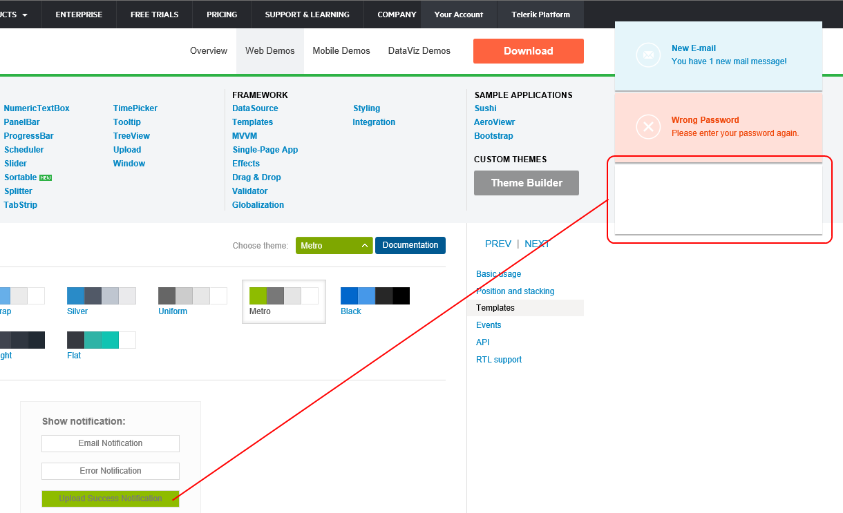 The Notifications Templates demo creates blank notifications for the Silver, Uniform and Metro themes. The problem is related to the text color.