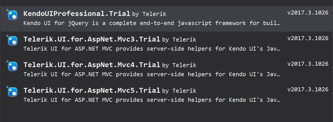 - Open the NuGet Package Manager, select the Browse tab and search for the "Telerik.UI.for.AspNet.Core.Trial" package and install it.
