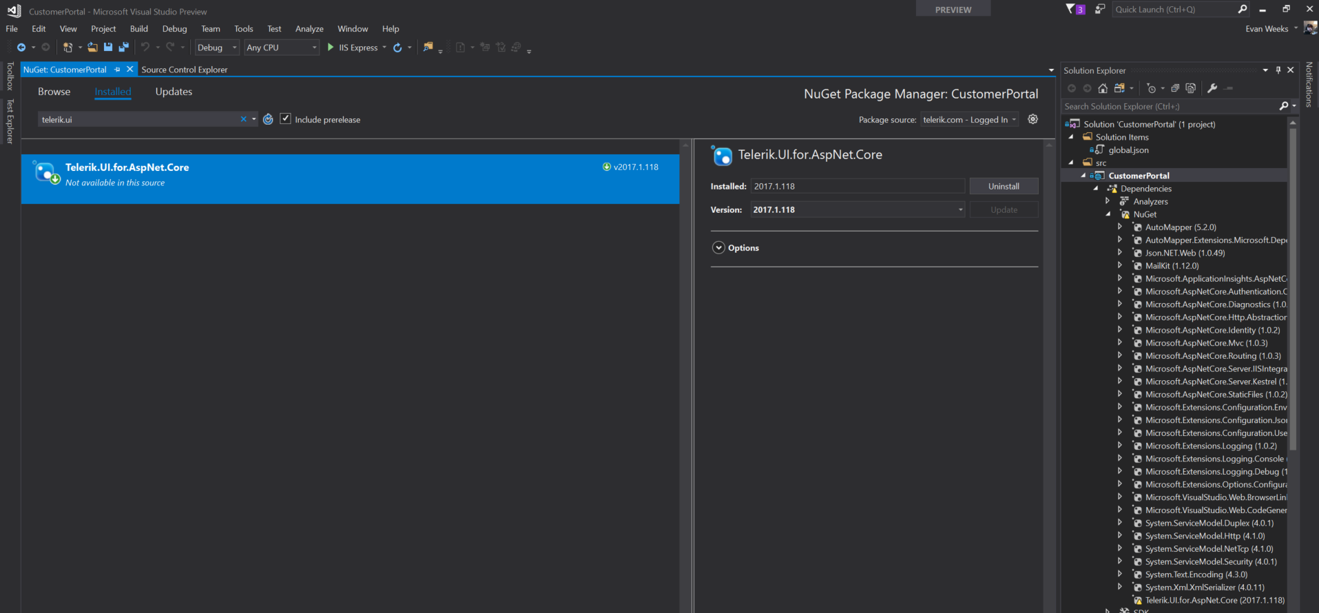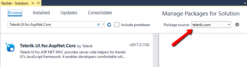 After the above step is successfully completed, restart Visual Studio in order for the new NuGet source to become available. Then, you should be able to install the Telerik.UI.for.AspNet.Core package by opening the NuGet Package Manager and then selecting the Telerik package source:
