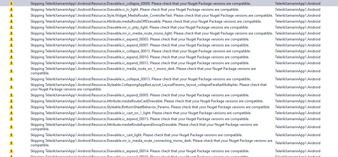 WarningSkipping TelerikXamarinApp1.Android.Resource.Drawable.ic_collapse_00009. Please check that your Nuget Package versions are compatible.TelerikXamarinApp1.Android"