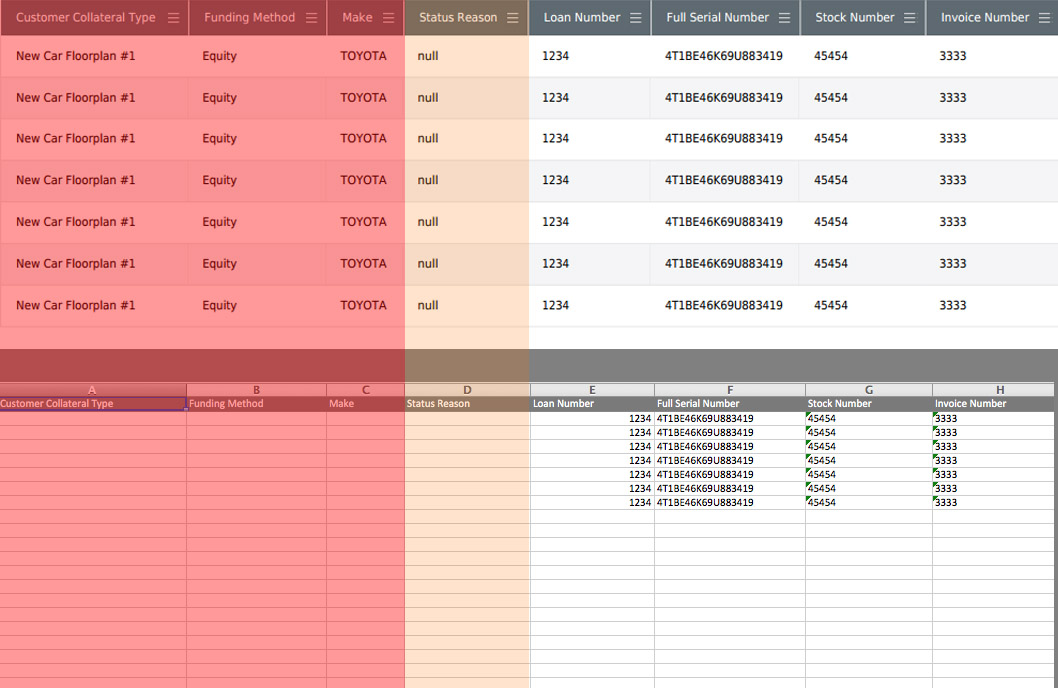 2. In the orange-highlighted section, the field is suppose to be empty, so the excel is actually displaying the grid correctly. But the PDF is displaying the value "null". Why is that?!?!