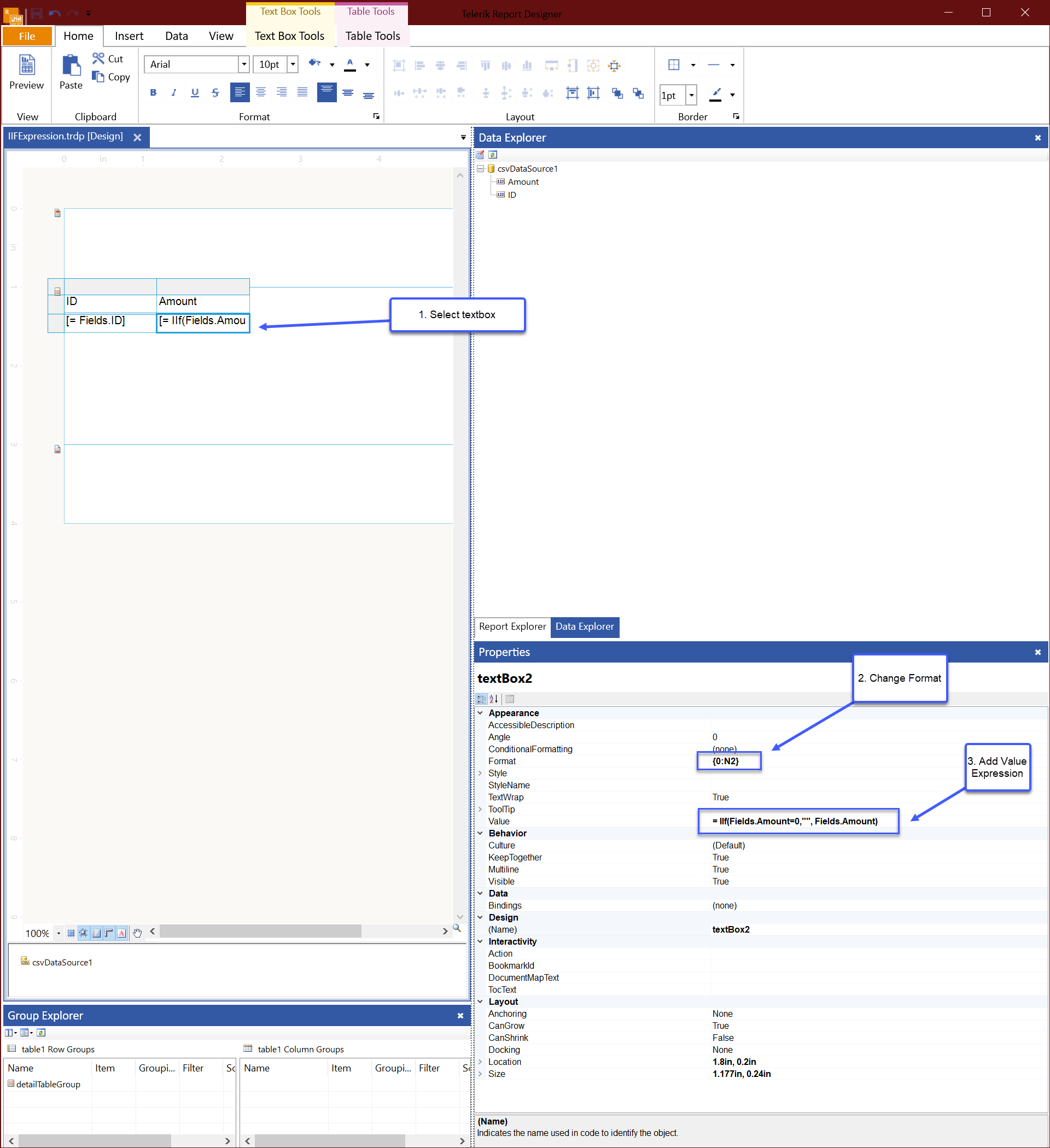 The best way to achieve this is to use our Expression Editor for the Value field of the TextBox. Let me review an example below.