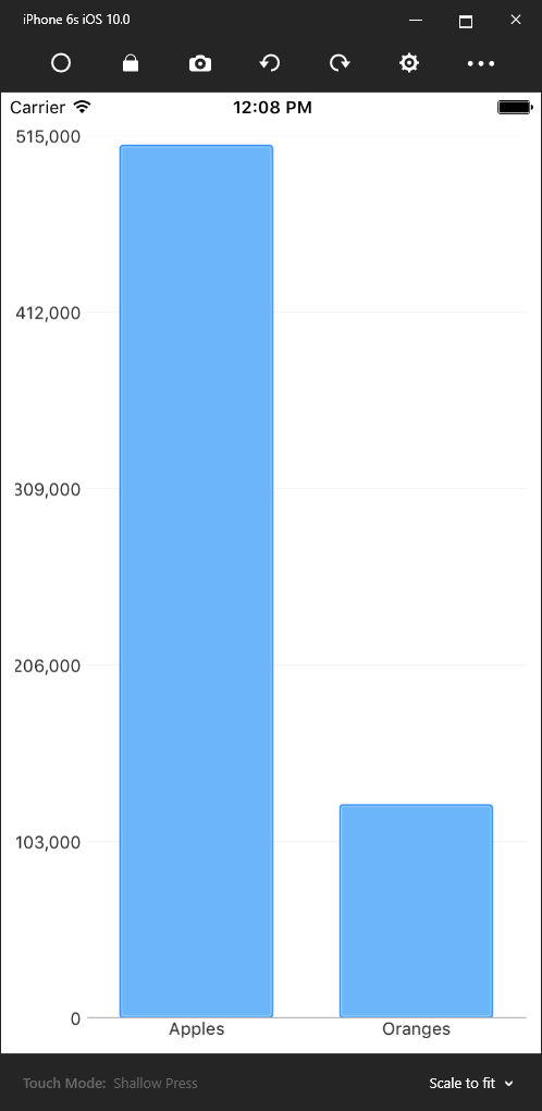 // In StartPageViewModel.csnew ChartData { Category = "Apples", Value = 510000.25 },new ChartData { Category = "Oranges", Value = 125000 }If you're still having an issue, please provide us with a reproducible example so that we can investigate further. You can also just update my demo so that it replicates the issue and send that back instead. Note that you'll need to open a support ticket because you can't attach zip folders to public forum posts. You can open a ticket from your Support Tickets Page.