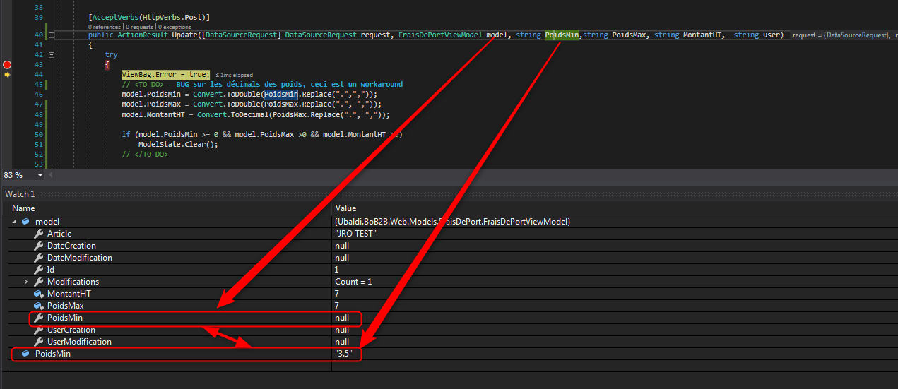 public class FraisDePortViewModel : IValidatableObject { public int Id { get; set; } [Required, StringLength(100, MinimumLength = 3, ErrorMessage = "Le Nom de l'Article de Transport doit faire entre 3 et 100 charactères")] [DisplayName("Article de Transport")] public string Article { get; set; } [Required] [UIHint("Poids")] public double? PoidsMin { get; set; } [Required] [UIHint("Poids")] public double? PoidsMax { get; set; } [UIHint("Currency")] [Required, Range(1, 9999, ErrorMessage = "Le Montant HT doit être supérieur à 0 €")] public decimal? MontantHT { get; set; } [DisplayFormat(DataFormatString = "{0:dd/MM/yyyy HH:mm}", ApplyFormatInEditMode = true)] [DisplayName("Créé le")] public DateTime? DateCreation { get; set; } [DisplayName("Créé par")] public string UserCreation { get; set; } [DisplayFormat(DataFormatString = "{0:dd/MM/yyyy HH:mm}", ApplyFormatInEditMode = true)] [DisplayName("Modifié le")] public DateTime? DateModification { get; set; } [DisplayName("Modifié par")] public string UserModification { get; set; } public List<FraisDePortLog> Modifications { get; set; } public IEnumerable<ValidationResult> Validate(ValidationContext validationContext) { if (PoidsMin > PoidsMax) { yield return new ValidationResult("Le Poids Minimum doit être supérieur au Poids Maximum ", new List<string> { "Poids" }); } } }