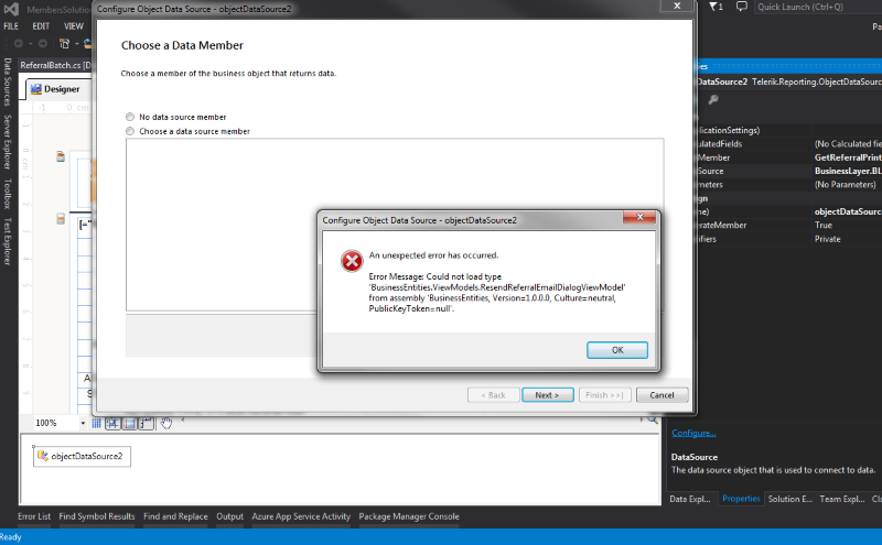 I have an existing Telerik report - designed in Visual Studio. It's been in production for several months. When I try to change the object data source on it now, it throws an error (can't load type xxx from assembly xxx). There's absolutely nothing wrong with my assemblies, this project compiles and runs fine and has been in production for several months as I said. Any idea what's causing this? I cannot contact support because the license has expired.
