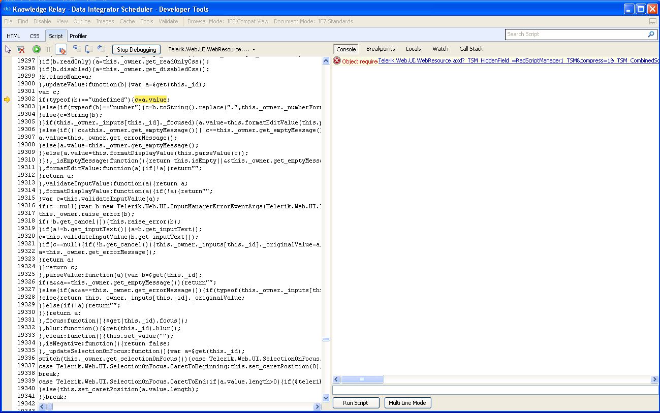 protected void NotificationChanged(object sender, EventArgs e) { ChangeNotificationUI(); } private void ChangeNotificationUI() { bool blnDisplayNotificationList = this.SendSuccessful.Check || this.SendFailed.Checked; this.PanelEmailDetail.Visible = blnDisplayNotificationList; }Ajax works when the either of the buttons are checked or unchecked and the panel is visible; I see the loading panel appear and then disappear after the server side processing. It also works when both buttons are unchecked; the loading panel appears and as soon as the server side processing is done, the panel is set to not visible. The thing that has started happening is when the panel is set to not visible and a check box is checked, instead of the loading panel, I get a webpage error which says "Error: Object required." If I use the IE script debugger, the line that is failing has "if (typeof(b) =="undefined") {c=a.value;" and the error message says something like: "Object required: Telerik.Web.UI.WebResource.axd? TSM HiddenField =RadScriptManager1 TSM&compress=1& ..." I am attaching a screenshot with more information.