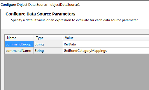 I am trying to use the ObjectDataSource with some parameters being passed to the DataMember method (it returns a data table and accepts 2 string parameters). Have configured the values to be passed in the 'Configure Data Source Parameters' screen of the DataSource wizard.
