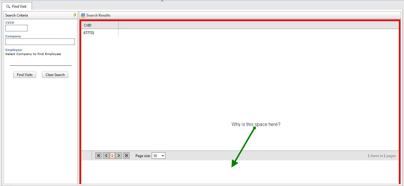 I have a grid which is set to 100% height. The grid displays search results. When a user clicks on the "find" button, the results are loaded in the grid. In IE (9), the grid appears correctly. In Firefox (15), there is a vertical space of about 125px below the grid pager and the grid doesn't extend all the way down to the bottom of its container. If the user clicks on "search" a second time, the grid extends properly. I have attached two screen captures demonstrating what it looks like in ie (correct) and firefox (incorrect). I have added a panel with colored background as a container for the grid so you can see it appears to be the grid which is not extending and not the container. This effect occurs even if I do not include this panel. My markup is below.