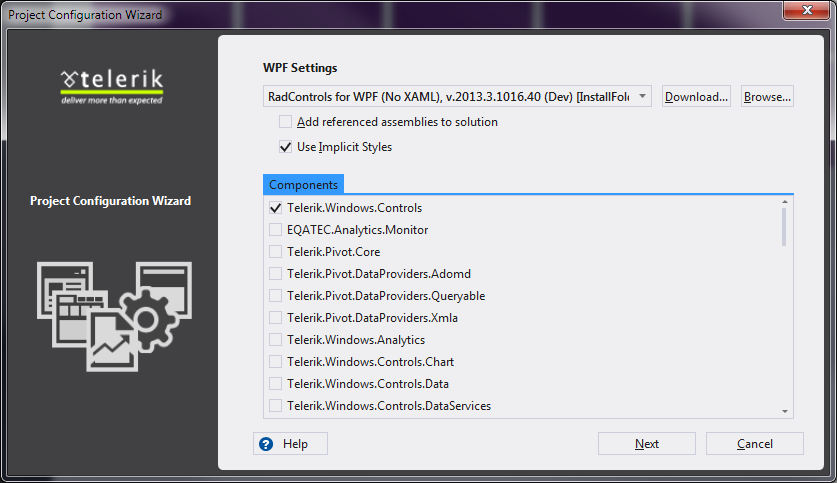 We have done our best to allow our clients easily create new projects using the implicit styles. For example if you install our controls for WPF you will have Telerik new project templates for creating an implicit styles enabled project. You can create a project using implicit styles without a single line of code. How to - please check the 4 attached screenshots (CreatingImplicitStylesApp00.png, CreatingImplicitStylesApp01.png, CreatingImplicitStylesApp02.png, CreatingImplicitStylesApp03.png)
