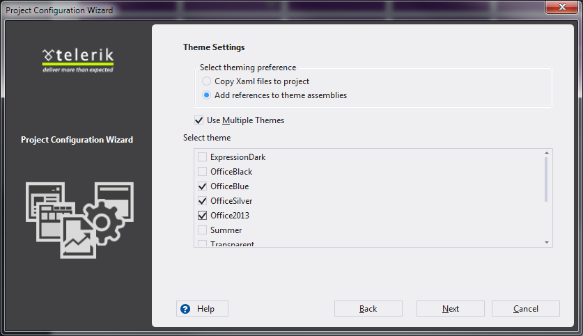 using System;using System.Windows;namespace SampleWPFApp{ public partial class MainWindow : Window { public MainWindow() { InitializeComponent(); } private void Blue_Click(object sender, RoutedEventArgs e) { ChangeTheme("Office_Blue"); } private void Silver_Click(object sender, RoutedEventArgs e) { ChangeTheme("Office_Silver"); } private void Office2013_Click(object sender, RoutedEventArgs e) { ChangeTheme("Office2013"); } private static void ChangeTheme(string theme) { Application.Current.Resources.MergedDictionaries.Clear(); MergeThemeResourceDictionary(theme, "System.Windows"); MergeThemeResourceDictionary(theme, "Telerik.Windows.Controls"); MergeThemeResourceDictionary(theme, "Telerik.Windows.Controls.Input"); MergeThemeResourceDictionary(theme, "Telerik.Windows.Controls.Navigation"); } private static void MergeThemeResourceDictionary(string theme, string assembly) { var resourceDictionary = new ResourceDictionary(); var uriPath = string.Format("/Telerik.Windows.Themes.{0};component/Themes/{1}.xaml", theme, assembly); resourceDictionary.Source = new Uri(uriPath, UriKind.RelativeOrAbsolute); Application.Current.Resources.MergedDictionaries.Add(resourceDictionary); } }}Should you have further problems, please do not hesitate to contact us.