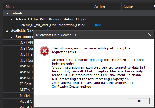 When I try to add help content to MS Help Viewer 2.3 I get a error message: For security reason DTD is prohibited in this XML document...