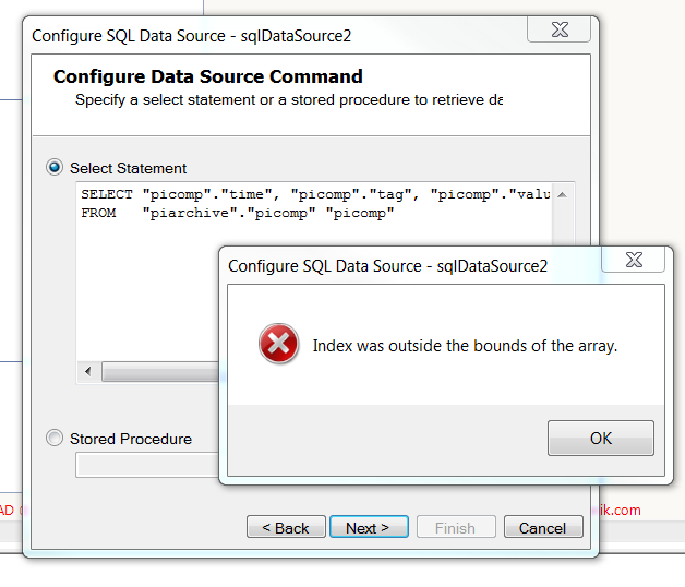 I am trying to connect to Osisoft PI through Oledb but get "Index was outside the bounds of the array" message that prevents me from making the connection. I'm using the 32-bit Report designer and 32-bit oledb on 64-bit Windows.