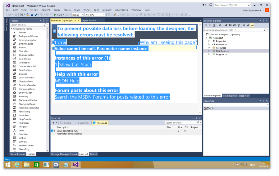 To prevent possible data loss before loading the designer, the following errors must be resolved: 1 Error Why am I seeing this page? Value cannot be null. Parameter name: instance Instances of this error (1) 1. Show Call Stack at System.ComponentModel.TypeDescriptor.AddAttributes(Object instance, Attribute[] attributes)at Microsoft.VisualStudio.Design.VSDesignSurface.CreateDesigner(IComponent component, Boolean rootDesigner)at System.ComponentModel.Design.DesignerHost.AddToContainerPostProcess(IComponent component, String name, IContainer containerToAddTo)at System.ComponentModel.Design.DesignerHost.PerformAdd(IComponent component, String name)at System.ComponentModel.Design.DesignerHost.System.ComponentModel.Design.IDesignerHost.CreateComponent(Type componentType, String name)at System.ComponentModel.Design.Serialization.DesignerSerializationManager.CreateInstance(Type type, ICollection arguments, String name, Boolean addToContainer)at System.ComponentModel.Design.Serialization.DesignerSerializationManager.System.ComponentModel.Design.Serialization.IDesignerSerializationManager.CreateInstance(Type type, ICollection arguments, String name, Boolean addToContainer)at System.ComponentModel.Design.Serialization.TypeCodeDomSerializer.Deserialize(IDesignerSerializationManager manager, CodeTypeDeclaration declaration)at System.ComponentModel.Design.Serialization.CodeDomDesignerLoader.PerformLoad(IDesignerSerializationManager manager)at Microsoft.VisualStudio.Design.Serialization.CodeDom.VSCodeDomDesignerLoader.PerformLoad(IDesignerSerializationManager serializationManager)at Microsoft.VisualStudio.Design.Serialization.CodeDom.VSCodeDomDesignerLoader.DeferredLoadHandler.Microsoft.VisualStudio.TextManager.Interop.IVsTextBufferDataEvents.OnLoadCompleted(Int32 fReload)