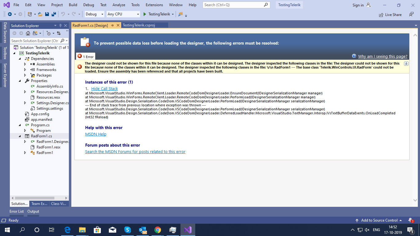 When am trying to open RadForm getting an error