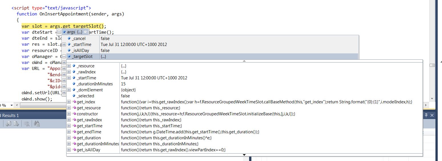 <telerik:RadScheduler ID="rsAppointments" runat="server" DataEndField="AppointmentEndDate" DataKeyField="PatientAppointmentID" DataStartField="AppointmentStartDate" DataSubjectField="AppointmentTypeID" DataDescriptionField="AppointmentTypeID" Height="600px" MinutesPerRow="15" onnavigationcomplete="rsAppointments_NavigationComplete" OnClientAppointmentInserting="OnInsertAppointment" OnClientAppointmentEditing="OnEditAppointment" GroupBy="Clinicians" onappointmentcreated="rsAppointments_AppointmentCreated" onappointmentupdate="rsAppointments_AppointmentUpdate" onappointmentdelete="rsAppointments_AppointmentDelete"> <TimelineView UserSelectable="False" /> <ResourceTypes> <telerik:ResourceType Name="Clinicians" KeyField="UserID" TextField="ClinicianName" ForeignKeyField="ClinicianID" /> </ResourceTypes> <AppointmentTemplate> <table border="0" cellpadding="3" cellspacing="0" width="100%"> <tr> <td style="border: none;" rowspan="2"><asp:Literal ID="litContent" runat="server"></asp:Literal></td> </tr> </table> </AppointmentTemplate> <AppointmentContextMenuSettings EnableDefault="true" /> <TimeSlotContextMenuSettings EnableDefault="true" /> </telerik:RadScheduler>function OnInsertAppointment(sender, args) { var slot = args.get_targetSlot(); var dteStart = slot.get_startTime(); var dteEnd = slot.get_endTime(); var res = slot.get_resource(); var resourceID = res.get_key(); var oManager = GetRadWindowManager(); var oWnd = oManager.getWindowByName("rwAppointment"); var URL = "AppointmentEdit.aspx?mode=insert&start=" + dteStart.toString("dd/MM/yyyy HH:mm:ss tt") + "&end=" + dteEnd.toString("dd/MM/yyyy HH:mm:ss tt") + "&cID=" + resourceID + "&pid=" + <%= PatientID %>; oWnd.setUrl(URL); oWnd.show(); args.set_cancel(true); }