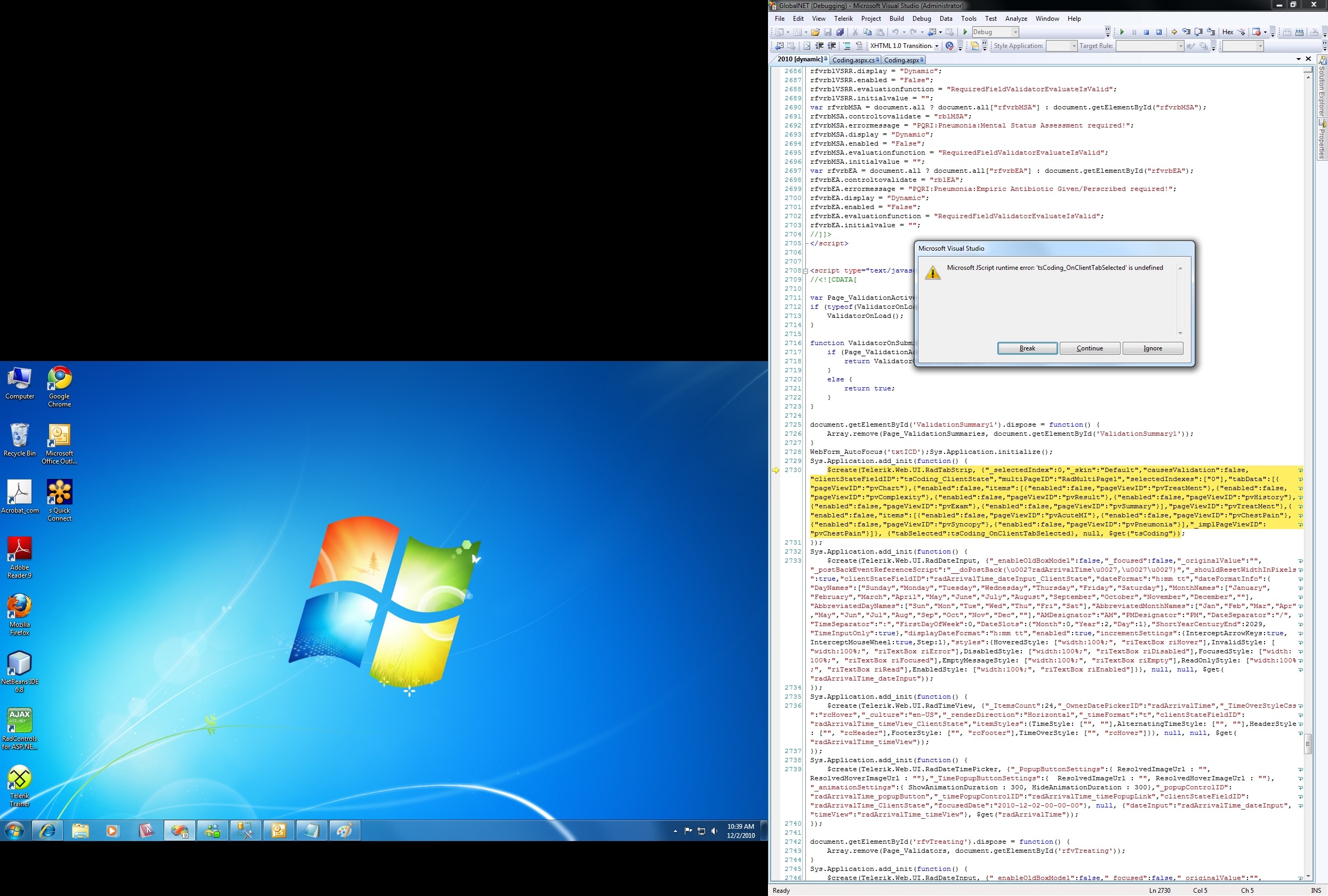 When I remove the OnClientTabSelected="tsCoding_OnClientTabSelected" from the tabstrip, the page works fine. Having it in there causes the attached error.