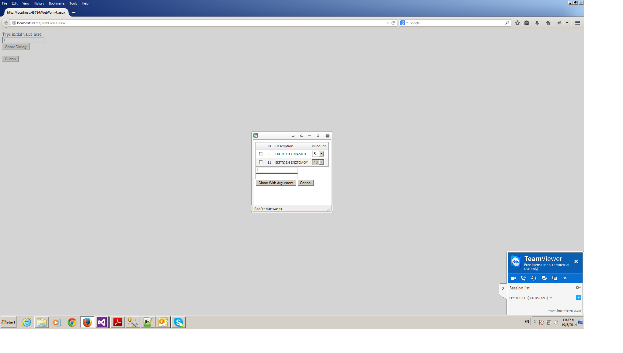 <script type="text/javascript"> function ShowDialoag(sender, args) { var textbox = $find("<%=radtxtInput.ClientID%>"); radopen("ShowDialog.aspx?TextBoxValue=" + textbox.get_value(), null); } function OnClientClose(oWnd, args) { var arg = args.get_argument(); if (arg) { var txtValue = arg.txtValue; $find("<%=radtxtOutput.ClientID%>").set_value(txtValue); } }</script>RadWindow Page ASPX: