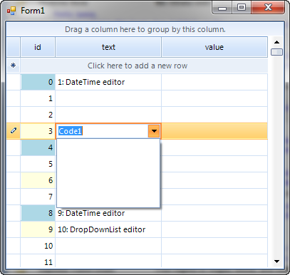 void InitializeGrid() { DataTable tbl = new DataTable("MainTable"); tbl.Columns.Add(new DataColumn("id", typeof(Int32))); tbl.Columns.Add(new DataColumn("text", typeof(String))); tbl.Columns.Add("value", typeof(object)); tbl.PrimaryKey = new DataColumn[] { tbl.Columns["id"] }; for (int i = 0; i < 1000; i++) { string textValue; object value = null; if (i % 4 == 0) { textValue = String.Format("{0}: DateTime editor", i + 1); value = DateTime.Now; } else if (i % 3 == 0) { textValue = String.Format("{0}: DropDownList editor", i + 1); value = (i % 5); } else { textValue = String.Empty; //String.Format("{0}: default editor", i + 1); } tbl.Rows.Add(i, textValue, value); } DataTable tbl2 = new DataTable("Codes"); tbl2.Columns.Add("code", typeof(Int32)); tbl2.Columns.Add("codeName", typeof(String)); for (int i = 0; i < 5; i++) { tbl2.Rows.Add(i, String.Format("Code{0}", i + 1)); } _ds = new DataSet(); _ds.Tables.Add(tbl); _ds.Tables.Add(tbl2); this.radGridView1.DataMember = "MainTable"; this.radGridView1.DataSource = _ds; this.radGridView1.Columns["text"].Width = 150; this.radGridView1.Columns["value"].Width = 150; //GridViewTextBoxColumn col = new GridViewTextBoxColumn(); //col.HeaderText = "CustomColumn"; //col.UniqueName = "CustomColumn"; //col.Width = 150; //this.radGridView1.Columns.Add(col); }I'm just setting some values here, and in the previous method i have changed the ValueMember for the DropDown.
