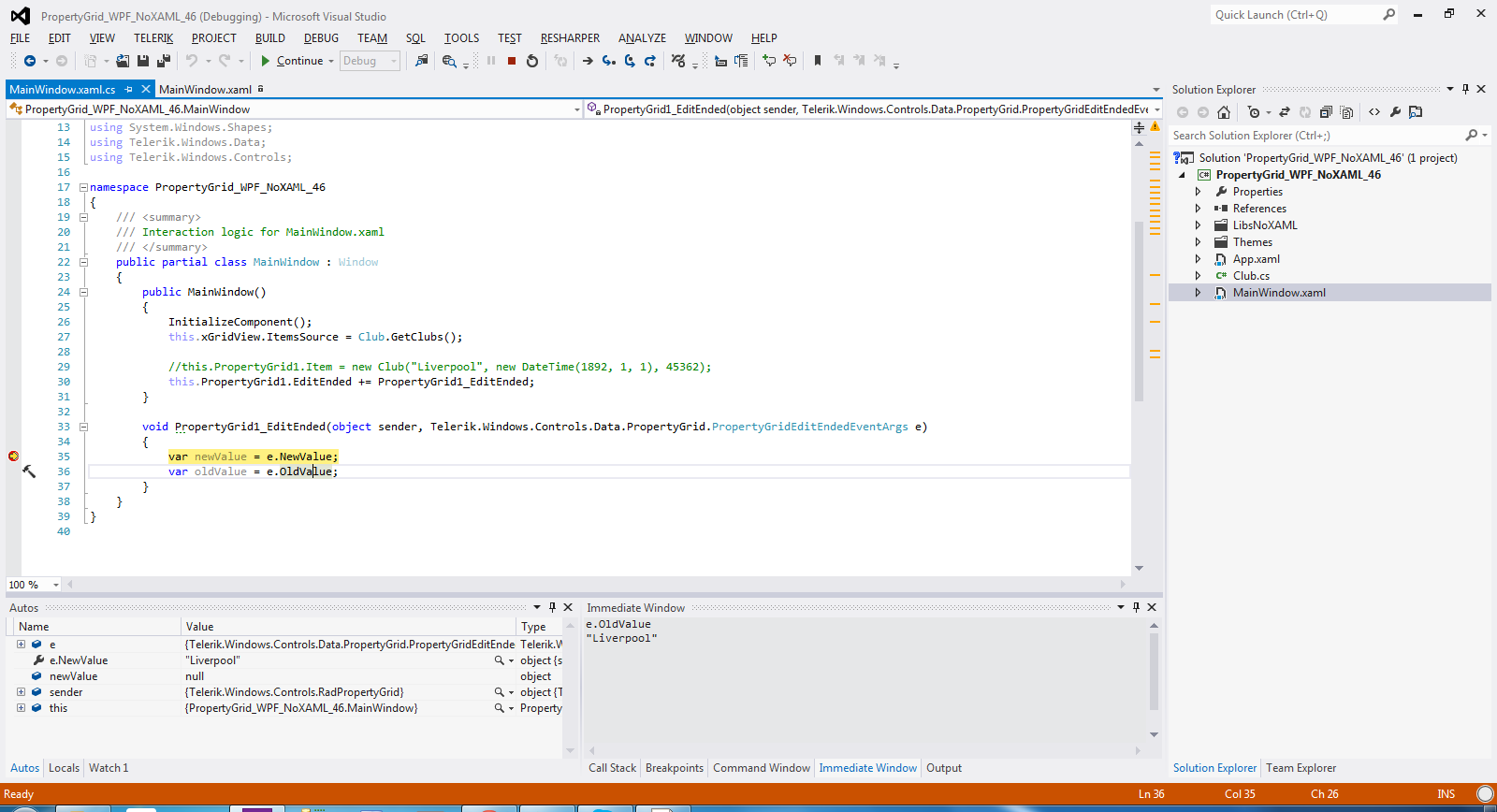 This approach is essentially what I am doing and I am seeing the same behavior in your sample project. I select the first row in the grid view, then go to the Name property in the property grid. I change the value from "Liverpool" to "Test" and in the event handler the old value still says "Liverpool". You can see this in the immediate pane in the screen shot below.