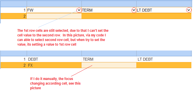 How do I change focus to next cell (similar to manual action), so I can able to set the value to next cell?