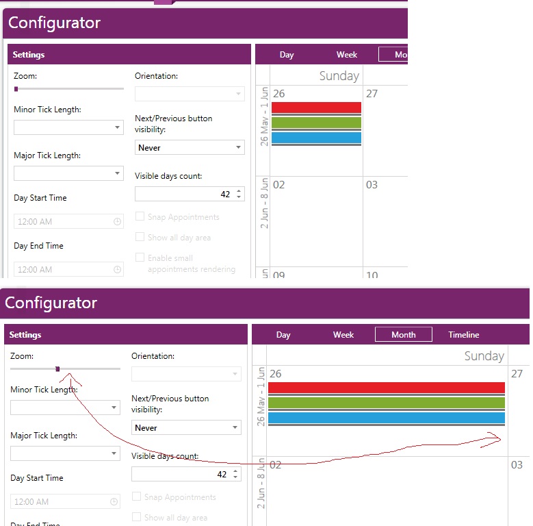 This is expected behavior, because the slider is bound to the MinTimeRulerExtent property of the TimeRuler and it causing the TimeRuler to extend horizontally when zooming in. This is because the MonthViewDefinition has more specific style and the TimeRuler is always placed horizontally rather than the other ViewDefinitions which can also have vertical TimeRuler.