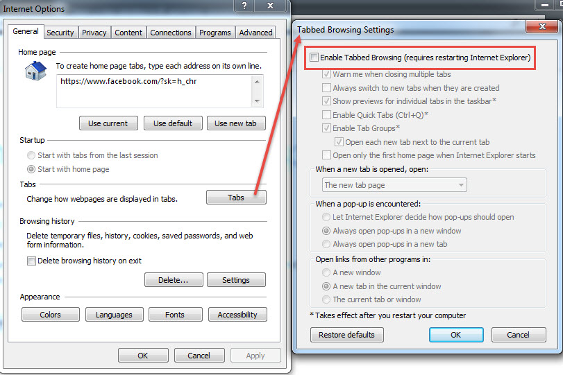 Specifically what we don't support is "Tabbed browsing" as shown in the attached screen shot. We do support multiple IE windows, just not tabs i.e. popup windows must open in a new window instead of a new tab.