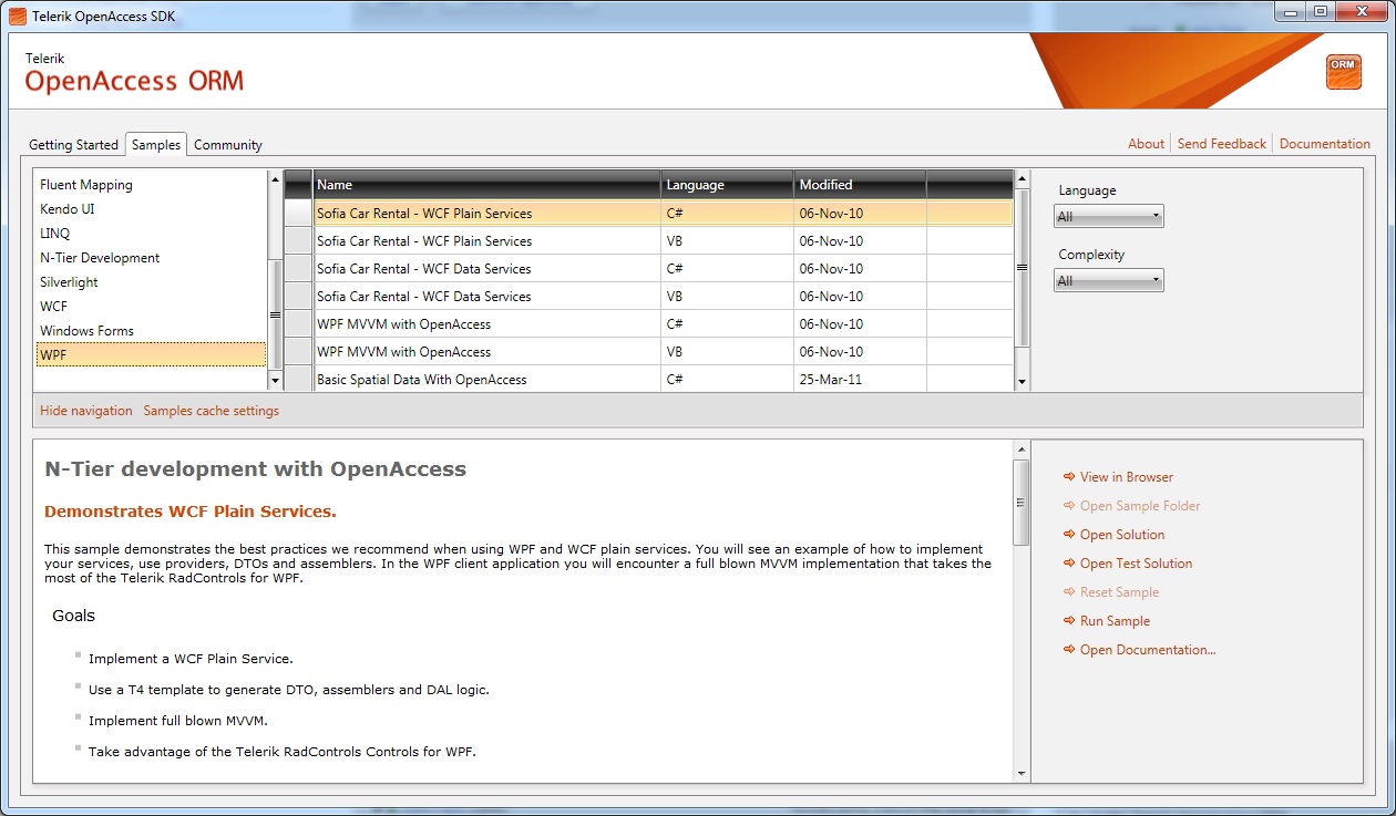 4) From the top left list, choose WPF (it is the last row). On the right list you will see all examples presenting how to use OpenAccess ORM with a WPF user interface, in C# and/or Visual Basic. You can start a sample directly or open it in Visual Studio.