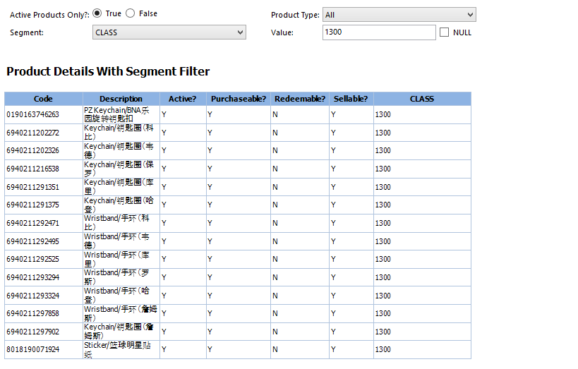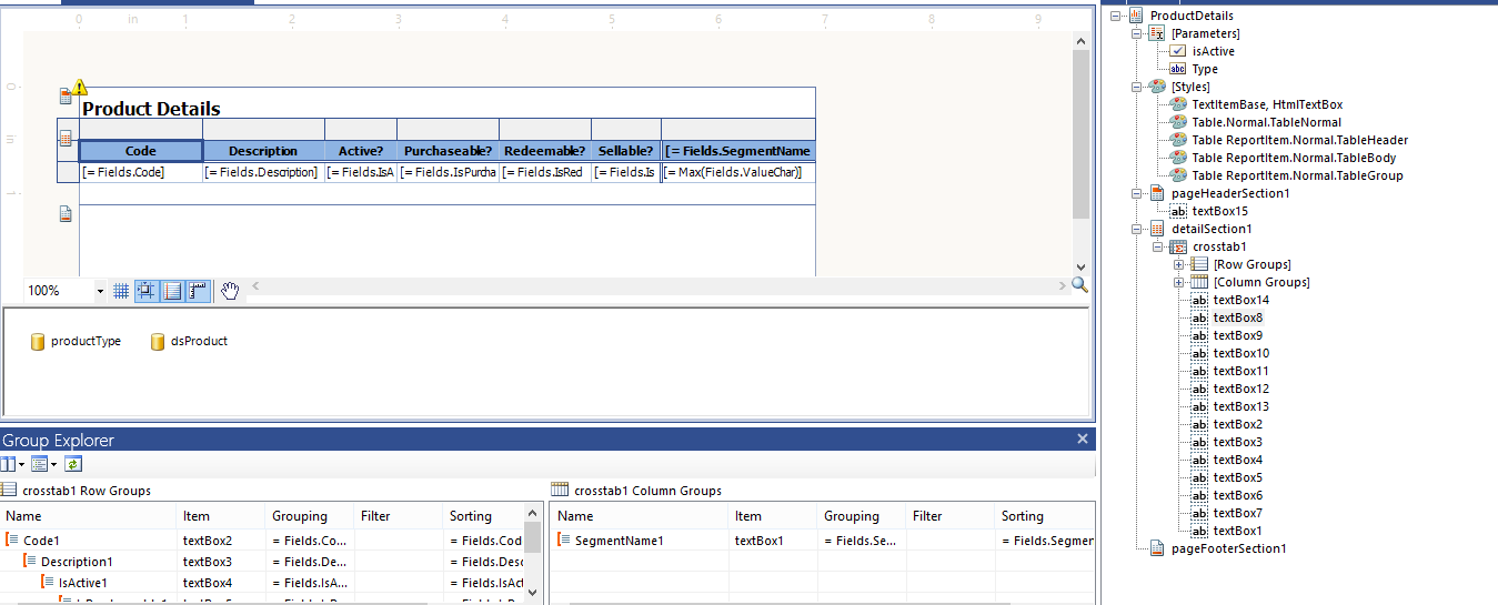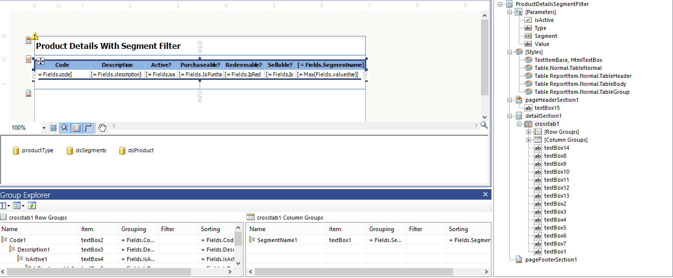 Columns up to 'Reemable?' are static columns. All columns after 'Reedeemable?' are segments. Segments are defined in a different table and are dynamic. Column grouping on segmentname is used to get all segment details for a product in a single row. There are filters on crosstable to see if only active products should be shown or only redeemable or sellable products should be shown.