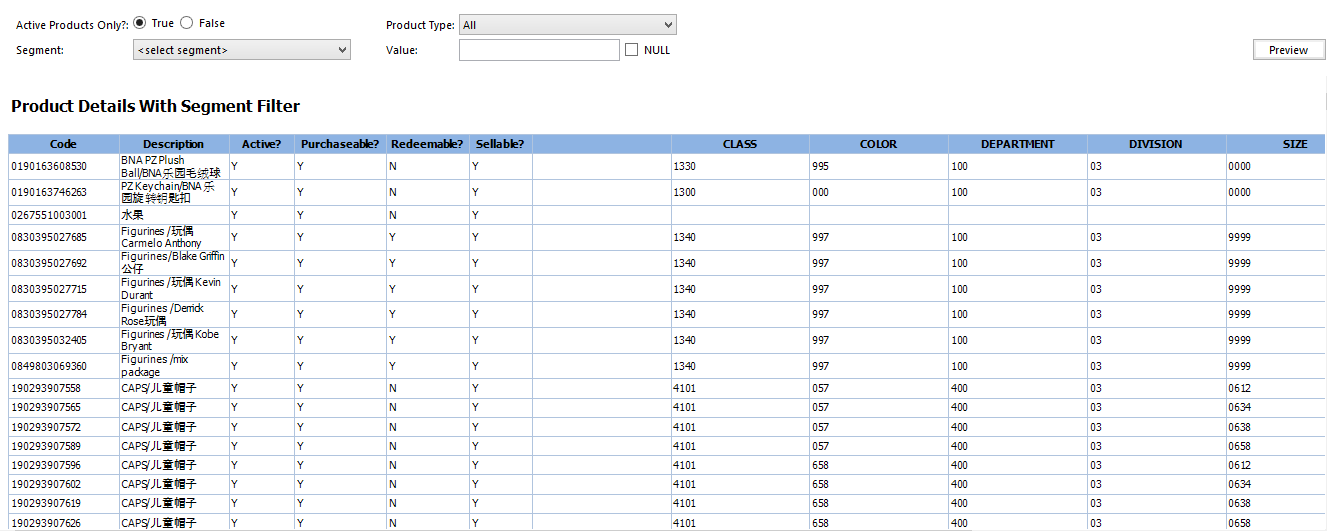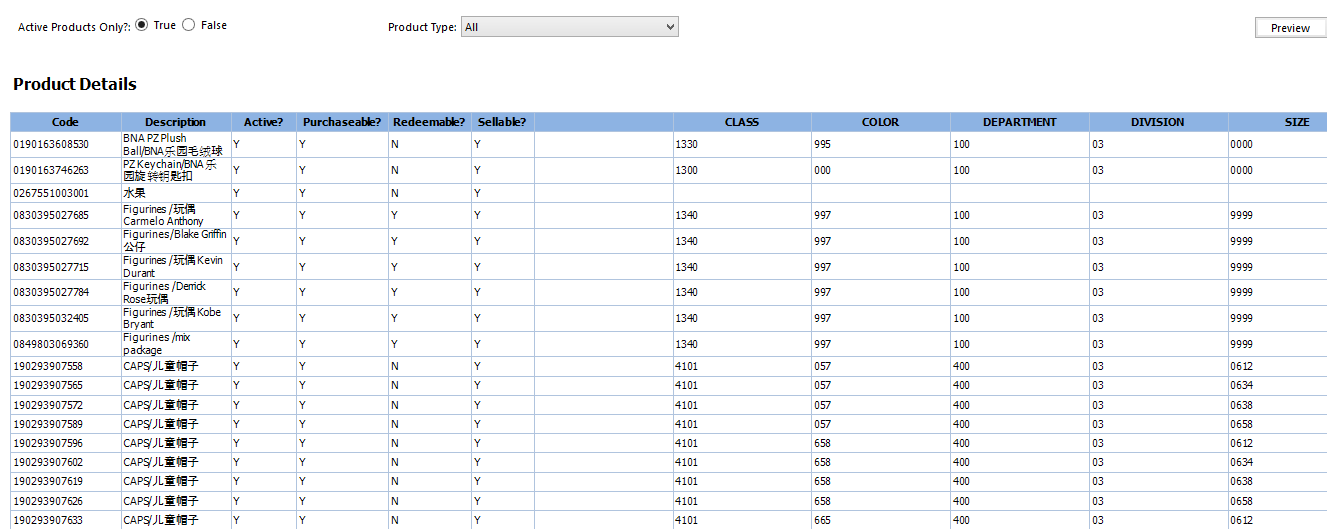 ID Code Description Barcode Active? Sellable? Redeemable? Size Color Class Department