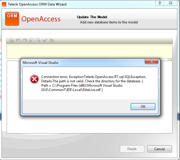 I was trying to update my Model based on some changes I made to the DB. OpenAccess is currently pointed at a SQL CE DB. When I go to Update from Database from the OpenAccess Model Schema Explorer I get the attached error. As you can see it is pointing at the IDE directory of my Visual Studios instead of the actual path located in my Project.
