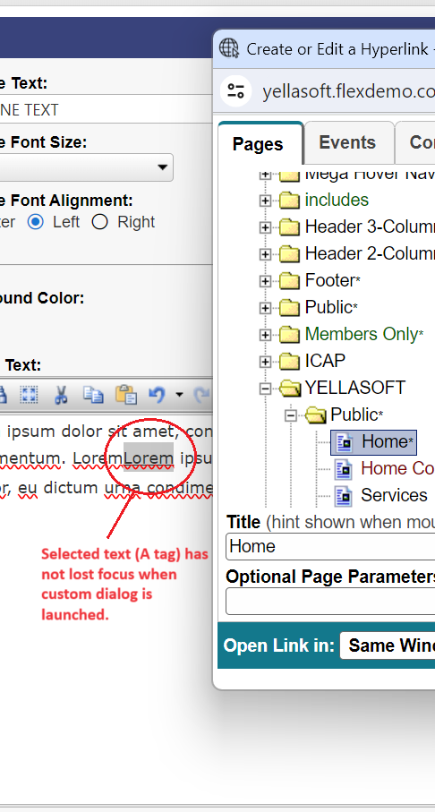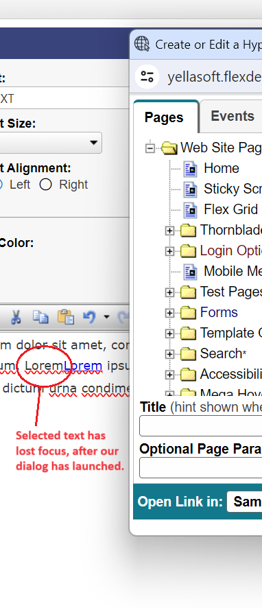 If plain text is selected (i.e.: no html formatting), the custom dialog is launched and the text loses it's focus which in-turn causes a hyperlink to be pasted directly after the text I had selected. If an A tag is selected, the custom dialog is launched and the selected A tag doesn't lose focus.