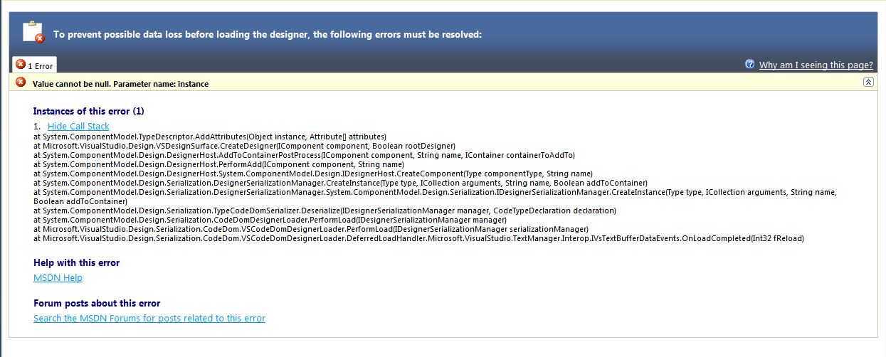 Opening a designer file for a Telerik Report causes an error to occur (Screenshot attached).