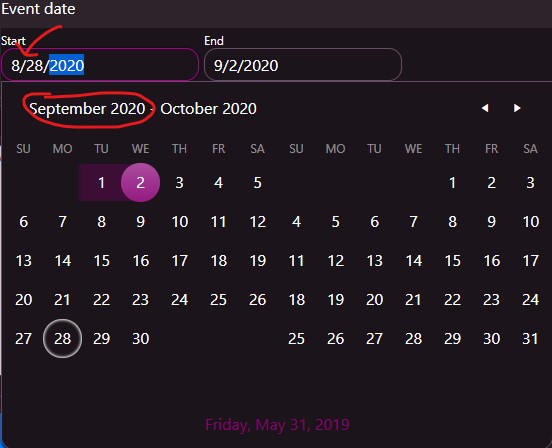 In order to resolve this I suggest subtracting one from StartDate.Month when setting the current view for the DateRangePicker: