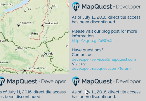 I'm using the OpenStreetMapProvider for a long time now, but since this monday I have a problem. Instead of the real map tiles see the the pictures you can see in the attached file. I don't understand whats wrong here. I'm not using MapQuest. And Openstreetmap is still free to use.