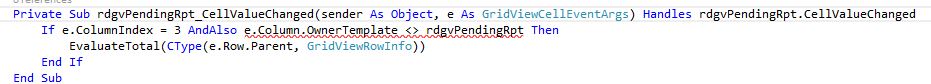 Private Sub rdgvPendingRpt_CellValueChanged(sender As Object, e As GridViewCellEventArgs) Handles rdgvPendingRpt.CellValueChanged