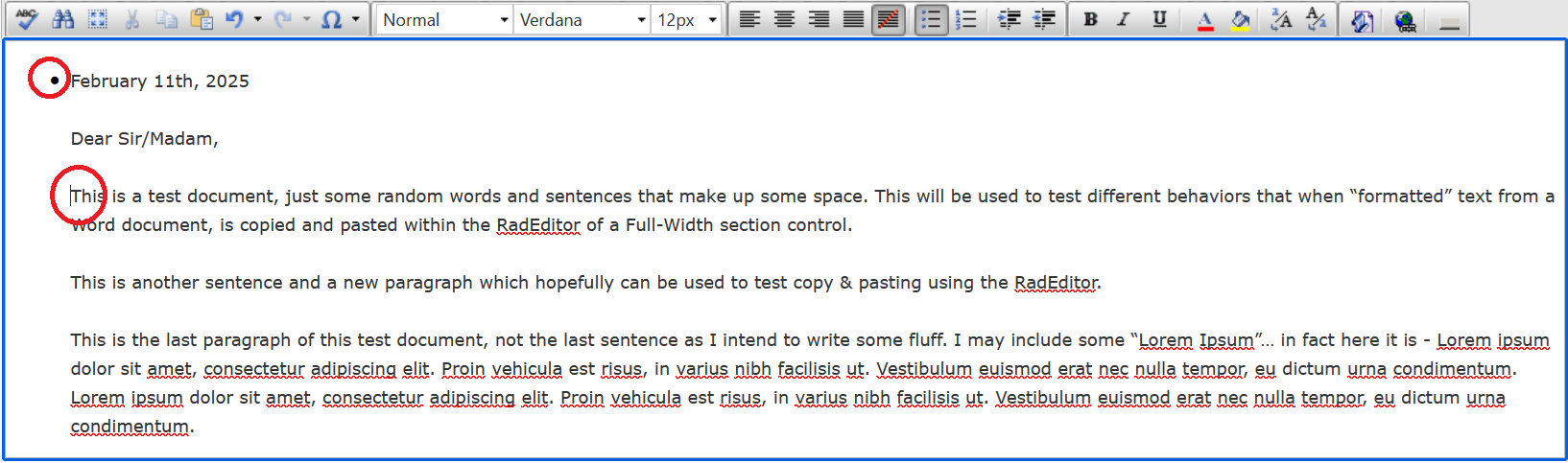 Thank you for providing the additional details!I tested the provided Word file by copying and pasting its content into the RadEditor demos but was unable to reproduce the reported issue. The Ordered and Unordered list commands in RadEditor apply only to block elements. In this case, the sentence "This is a test document" is wrapped in a paragraph tag, allowing the bullet to be applied correctly—unlike what is shown in the provided screenshot.