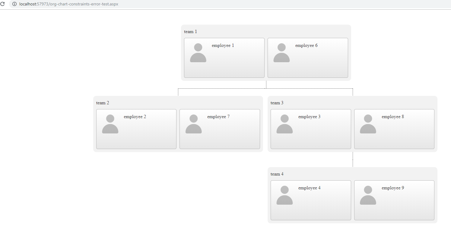usingSystem;usingSystem.Collections.Generic;usingSystem.Data;usingSystem.Data.Entity;usingSystem.Linq;usingSystem.Web;usingSystem.Web.UI;usingSystem.Web.UI.WebControls;usingOrgChartSice.Data;namespaceTelerikOrgChart{publicpartialclassProva : System.Web.UI.Page{privateDataTable teams;privateDataTable employees;protectedvoidPage_Load(objectsender, EventArgs e){OrgChartSiceDbContext orgChartSiceDbContext =newOrgChartSiceDbContext();var data = orgChartSiceDbContext.dbvw_HRZU_Organigramma_Azienda_Teste.ToList();var teamList = data.Select(c =>new{ c.IDBOX, c.IDBOXFATHER, c.DSBOX }).Distinct().ToList();var employeeList = data.Select(c =>new{ c.IDSUBJECT, c.IDBOX, c.NOMINATIVO }).Distinct().ToList();CreateTeams(teamList);CreateEmployees(employeeList);RadOrgChart1.GroupEnabledBinding.NodeBindingSettings.DataFieldID ="TeamID";RadOrgChart1.GroupEnabledBinding.NodeBindingSettings.DataFieldParentID ="ReportsTo";RadOrgChart1.RenderedFields.NodeFields.Add(newTelerik.Web.UI.OrgChartRenderedField() { DataField ="Team"});RadOrgChart1.GroupEnabledBinding.NodeBindingSettings.DataSource = teams;RadOrgChart1.GroupEnabledBinding.GroupItemBindingSettings.DataFieldID ="EmployeeID";RadOrgChart1.GroupEnabledBinding.GroupItemBindingSettings.DataFieldNodeID ="TeamID";RadOrgChart1.GroupEnabledBinding.GroupItemBindingSettings.DataTextField ="Name";RadOrgChart1.GroupEnabledBinding.GroupItemBindingSettings.DataSource = employees;RadOrgChart1.DataBind();}privatevoidCreateEmployees(IEnumerable<dynamic> data){employees =newDataTable();employees.Columns.Add("EmployeeID");employees.Columns.Add("TeamID");employees.Columns.Add("Name");//employees.Columns.Add("ImageUrl");foreach(var itemindata)employees.Rows.Add(newstring[] { item.IDSUBJECT, item.IDBOX, item.NOMINATIVO });}privatevoidCreateTeams(IEnumerable<dynamic> data){teams =newDataTable();teams.Columns.Add("TeamID");teams.Columns.Add("ReportsTo");teams.Columns["ReportsTo"].AllowDBNull =true;teams.Columns.Add("Team");foreach(var itemindata)teams.Rows.Add(newstring[] { item.IDBOX, item.IDBOXFATHER == item.IDBOX ?null: item.IDBOXFATHER, item.DSBOX });}}}
