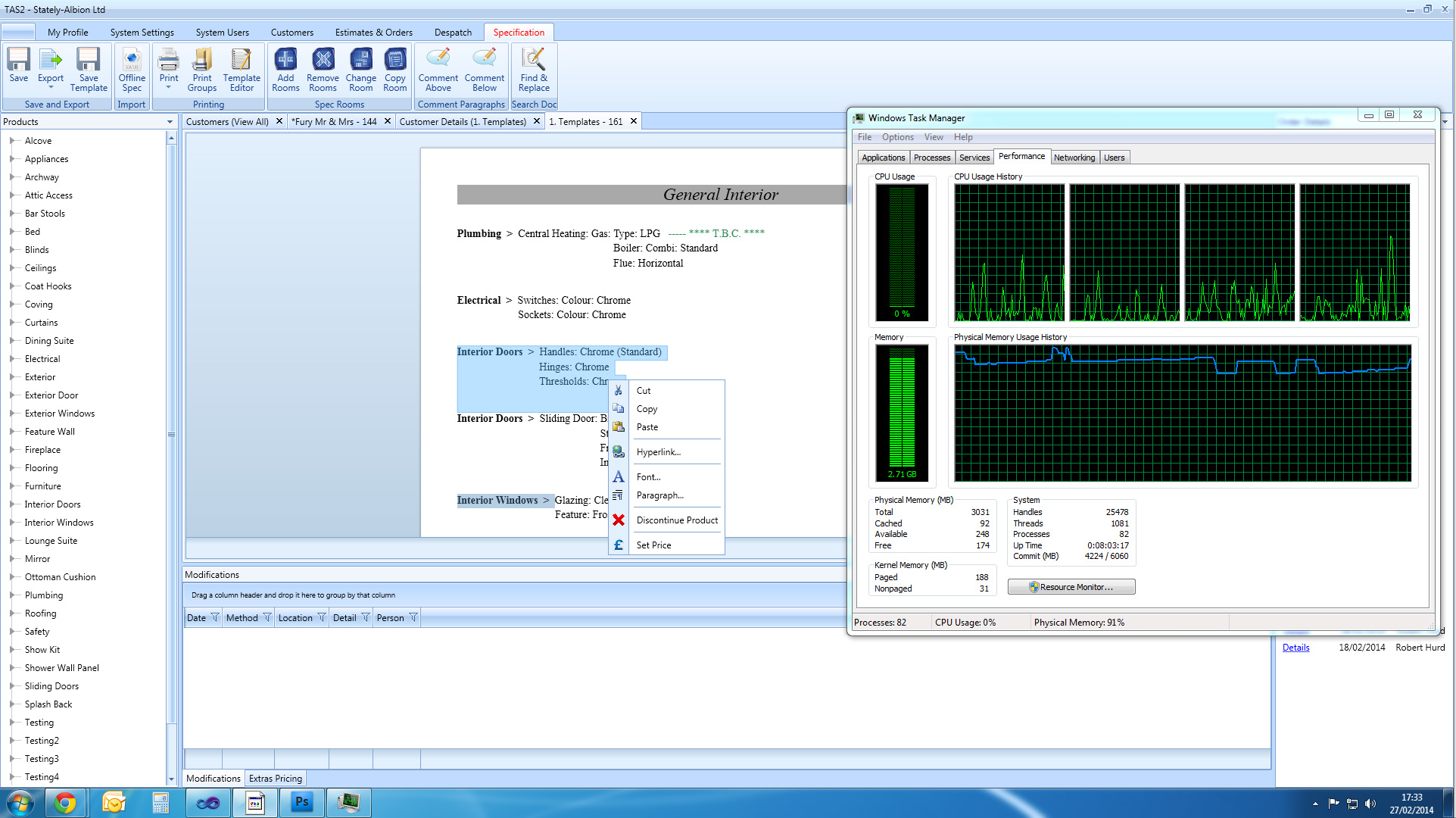 private void ContextMenuSubscribe(){ this.radRichTextBox.ContextMenu = new Telerik.Windows.Controls.RichTextBoxUI.ContextMenu(); ContextMenu contextMenu = (ContextMenu)this.radRichTextBox.ContextMenu; contextMenu.Showing += this.ContextMenu_Showing;}private void ContextMenu_Showing(object sender, ContextMenuEventArgs e){ #region Discontinue Product Menu Item // First check the context - if last selected annotation is product and user permissions if (Properties.Settings.Default.SystemUserPermissions.ProductsCanDiscontinue == true && !(this.radRichTextBox.Document.Selection.IsEmpty) && RadDocumentExtensions.GetLastSelectedAnnotationMarker(this.radRichTextBox.Document) is SemanticRangeStart) { //Get the selected annotations List<SemanticRangeStart> products = RadDocumentExtensions.GetSelectedAnnotationsRangeStarts<SemanticRangeStart>(this.radRichTextBox.Document); //Check Product Count is greater than 0 if (products != null && products.Count > 0) { //Add menu item to data context RadMenuItem discontinueProductMenuItem = new RadMenuItem() { Header = "Discontinue Product", Icon = new System.Windows.Controls.Image() { Source = new BitmapImage(new Uri("Icons/Spec-Editor-Menu/block.png", UriKind.Relative)) }, Tag = products[products.Count - 1] //Get last product item in selection }; discontinueProductMenuItem.Click += this.DiscontinueProductMenuItem_Click; ContextMenuGroup customContextMenuGroup = new ContextMenuGroup(); customContextMenuGroup.Add(discontinueProductMenuItem); e.ContextMenuGroupCollection.Add(customContextMenuGroup); } } #endregion #region Product Pricing Menu Item // First check the context - if selected annotation is end product and user permissions if (Properties.Settings.Default.SystemUserPermissions.OrderCanEdit == true && !(this.radRichTextBox.Document.Selection.IsEmpty) && RadDocumentExtensions.GetLastSelectedAnnotationMarker(this.radRichTextBox.Document) is SemanticRangeStart) { //Get the selected annotations List<SemanticRangeStart> products = RadDocumentExtensions.GetSelectedAnnotationsRangeStarts<SemanticRangeStart>(this.radRichTextBox.Document); //Checked the last selected item is an end item //if (products.Count >= 0 && products[products.Count - 1].Product.HasChild == false) //{ //Add menu item to data context RadMenuItem addPriceMenuItem = new RadMenuItem() { Header = "Set Price", Icon = new System.Windows.Controls.Image() { Source = new BitmapImage(new Uri("Icons/Spec-Editor-Menu/sterling_pound_currency_50.png", UriKind.Relative)) }, Tag = products[products.Count - 1] }; addPriceMenuItem.Click += this.SetPriceMenuItem_Click; ContextMenuGroup customContextMenuGroup = new ContextMenuGroup(); customContextMenuGroup.Add(addPriceMenuItem); e.ContextMenuGroupCollection.Add(customContextMenuGroup); //} } #endregion #region Add New Item To Database Menu Item //Check Conditions if (Properties.Settings.Default.SystemUserPermissions.ProductsCanAdd == true && this.radRichTextBox.Document.Selection.IsEmpty && RadDocumentAutoComplete.IsPositionBetweenDefinedAnnotations(this.radRichTextBox.Document.CaretPosition) == false) { //Check if text exists at caret position string text = RadDocumentExtensions.GetSpanBoxText(this.radRichTextBox.Document.CaretPosition); if (!String.IsNullOrWhiteSpace(text)) { text.Trim(); //Create New Menu Item RadMenuItem addNewItemToDatabase = new RadMenuItem() { Header = "Add New Item", Icon = new System.Windows.Controls.Image() { Source = new BitmapImage(new Uri("Icons/Spec-Editor-Menu/Database-Add-48.png", UriKind.Relative)) } }; addNewItemToDatabase.Click += this.AddNewItemToDatabaseMenuItem_Click; ContextMenuGroup customContextMenuGroup = new ContextMenuGroup(); customContextMenuGroup.Add(addNewItemToDatabase); e.ContextMenuGroupCollection.Add(customContextMenuGroup); } } #endregion}My application has also been designed to host multiple instance RadRichTextBox in RadDocking Panes (see the attached image). The docking panes are created and closed on a regular basis throughout the lifetime of the applications runtime.