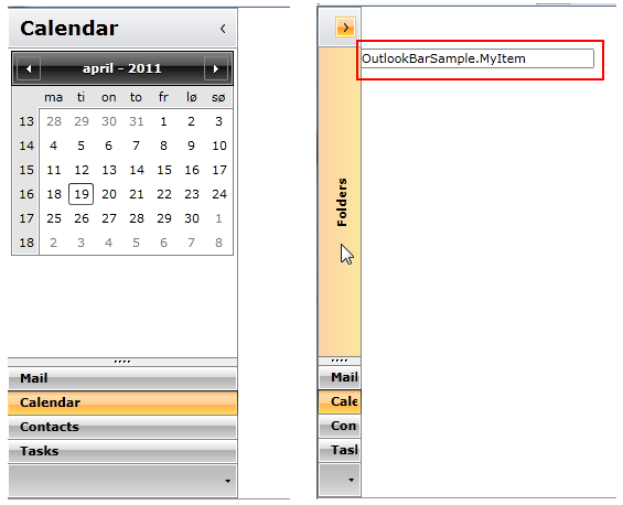 Seriously, I think it is necessary to make the 'Folders' text another dependency property, given it should be fairly cheap and easy to do. In many case, 'Folders' won't make any sense. In our case, we are using outlookbar as a quick menu, it has nothing to do with folders...